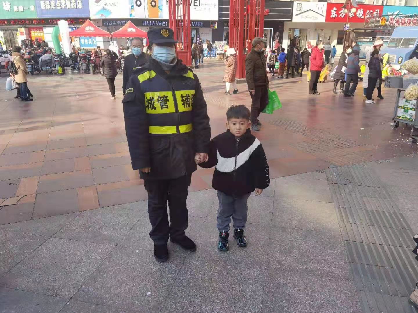 1月2日,宗保公司駐周浦市容項目隊員曹秋霞幫助走散男童找到家人。
