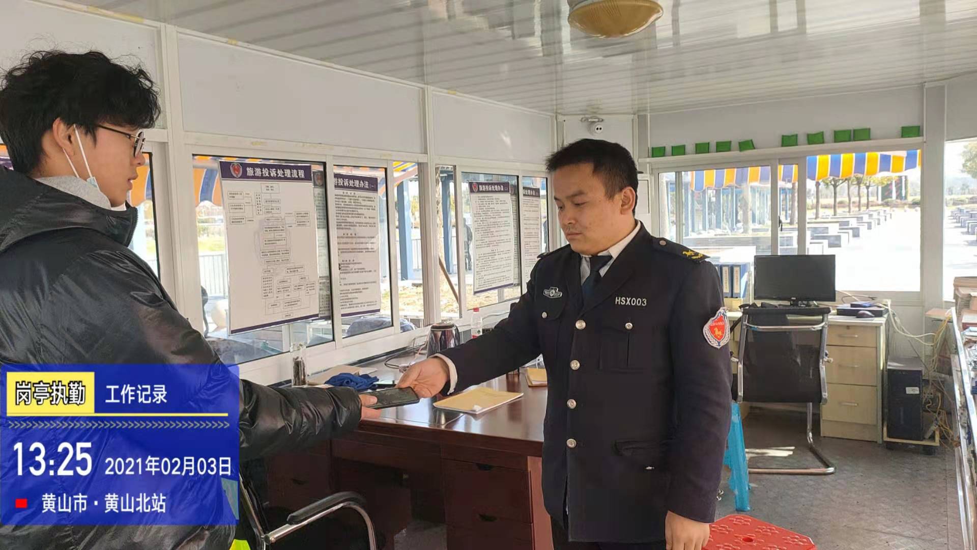隨后,有一人打來(lái)電話(huà),十分著(zhù)急,說(shuō)自己是失主。汪鑫安慰對方:“你別著(zhù)急,我們是宗保黃山文旅項目的隊員,你的手機被我們撿到了,我們在高鐵北站站前崗亭等你來(lái)取?!?br /> 13:25,一人急急地趕到崗亭。在確認其身份后,汪鑫將手機還給了失主,失主再三向隊員表示感謝。
