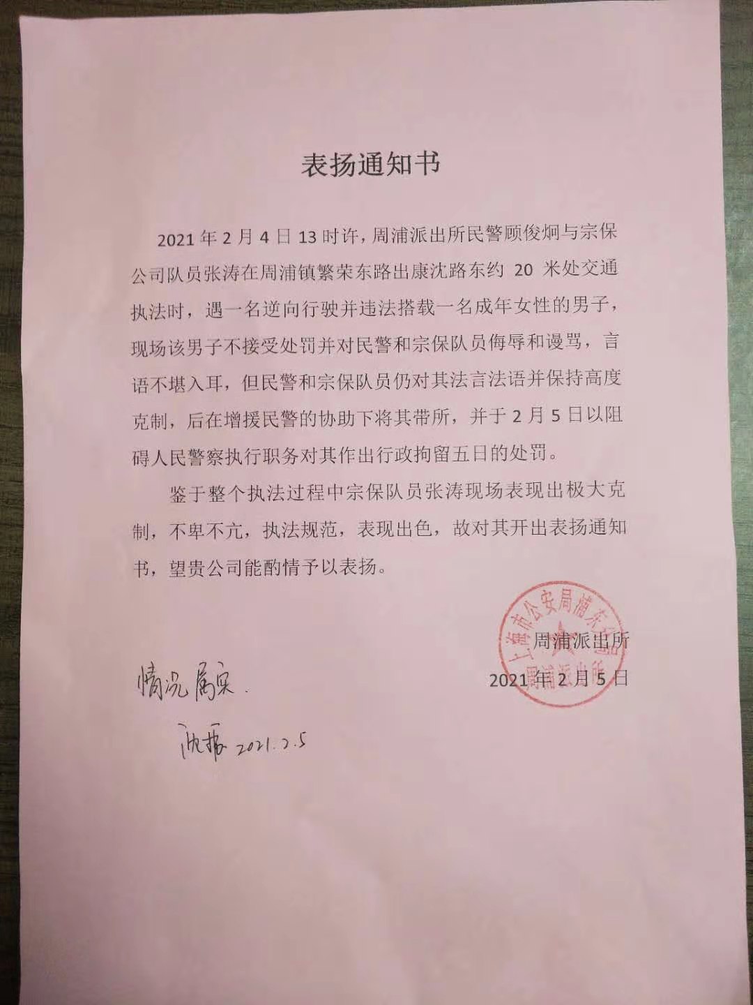 2月5日,宗保公司駐周浦輔警項目收到周浦派出所送來(lái)的一封表?yè)P信,信中對隊員張濤忍辱克制的優(yōu)秀表現提出了特別表?yè)P。