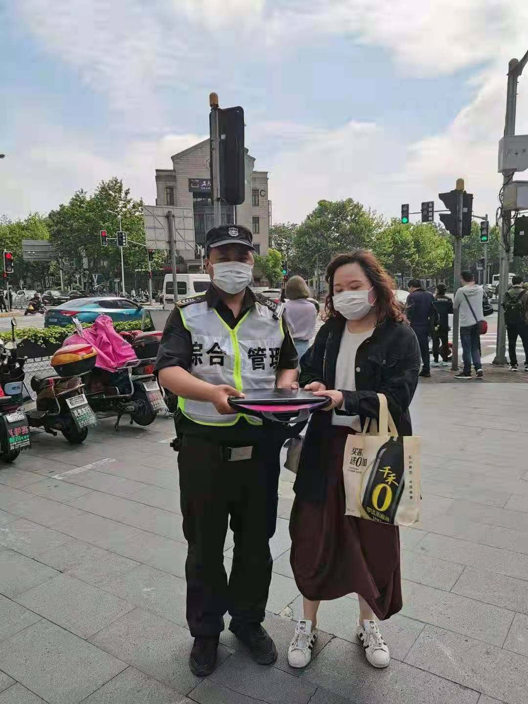 女士說(shuō):“我在附近寫(xiě)字樓上班,早上上班匆忙趕時(shí)間,粗心大意把電腦忘在單車(chē)上了,現在能順利找回來(lái),真是太感謝你了!”