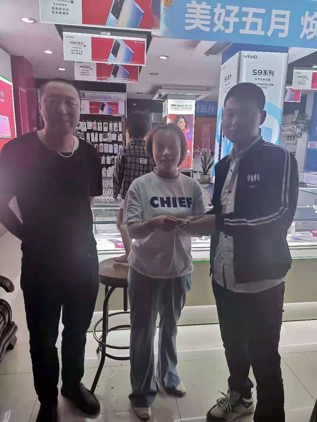 30多分鐘過(guò)去了,仍未見(jiàn)失主前來(lái)尋找。正當兩人準備將手機交到派出所時(shí),一女子打來(lái)電話(huà)說(shuō)自己是失主,是附近vivo手機店的店主,但因店里無(wú)人看店,暫時(shí)無(wú)法走開(kāi)。得知這一情況,兩人便主動(dòng)提出可以將手機送過(guò)去。