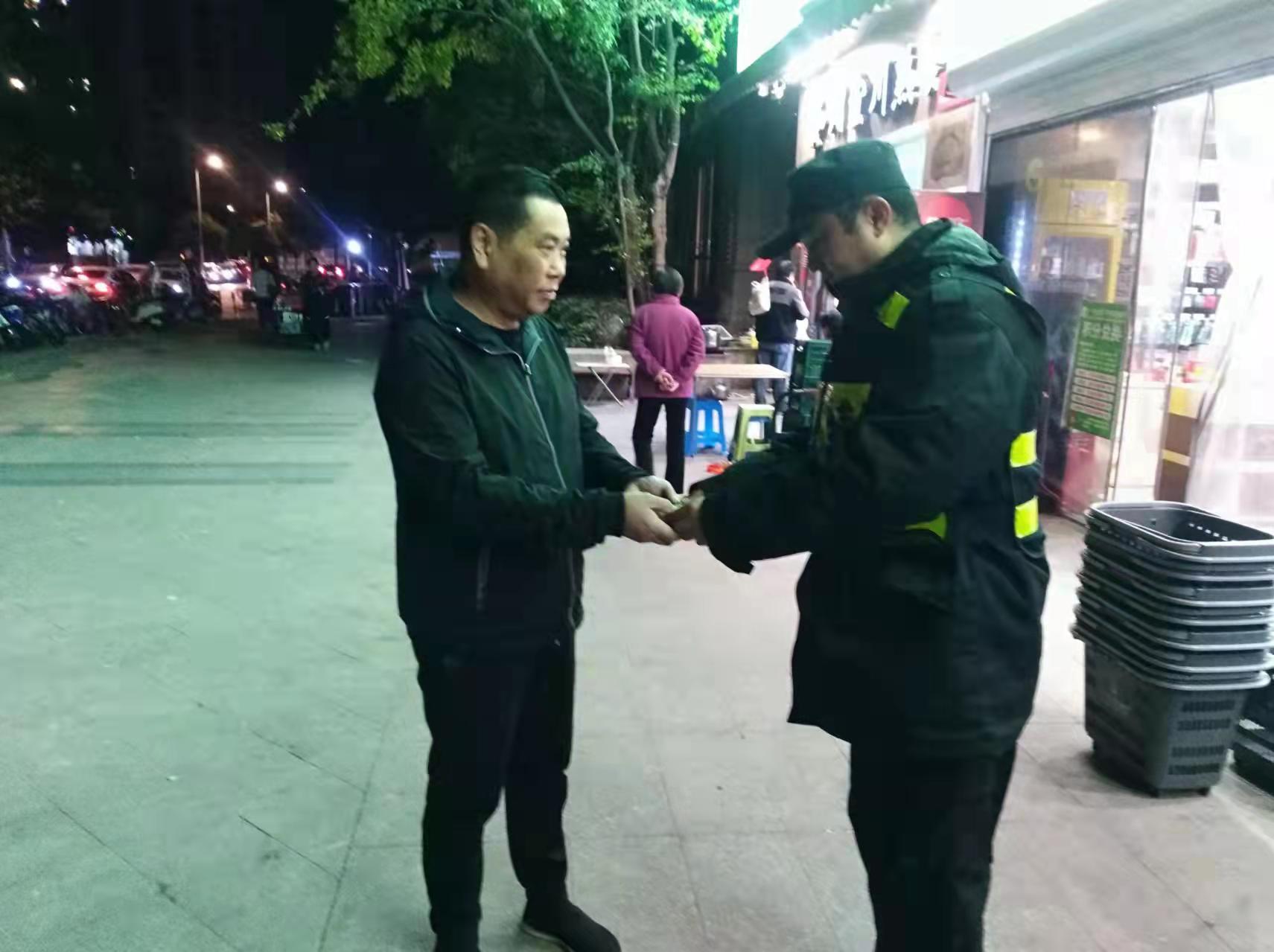 失主從商場(chǎng)前臺得知,徐周為了找到自己等了2個(gè)多小時(shí)很是感動(dòng),想請徐周吃飯以示感謝,被徐周婉拒,隨即又去超市買(mǎi)了包中華煙硬要塞給徐周,也被徐周謝絕了。隨后,徐周返回崗位繼續值勤。