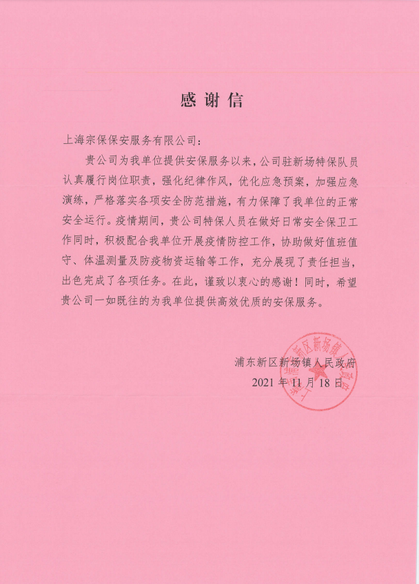11月18日,宗保公司收到浦東新區新場(chǎng)鎮人民政府的感謝信,信中對宗保隊員履職盡責的工作表現給予了充分肯定。