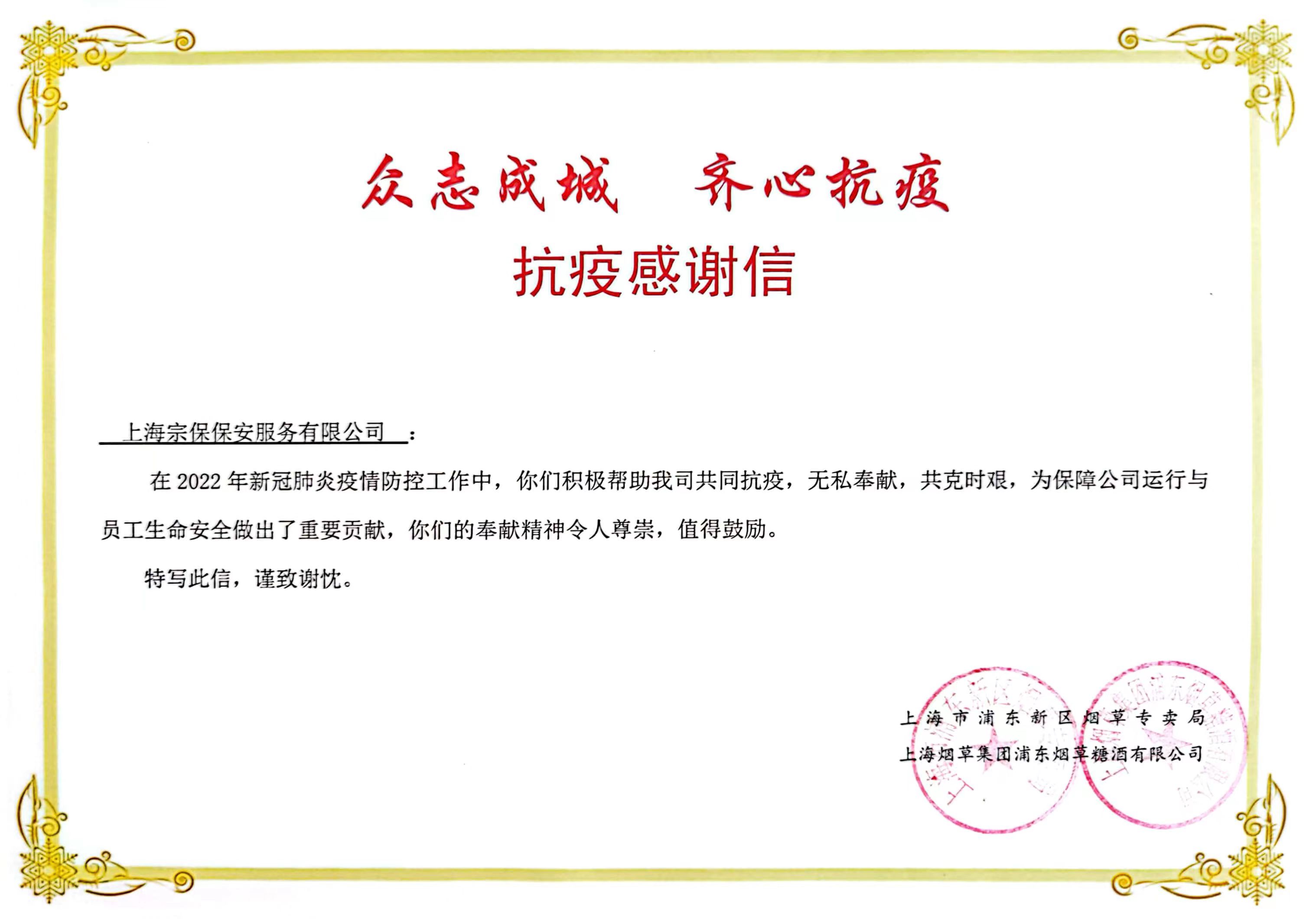8月16日,宗保公司收到上海市浦東新區煙草專(zhuān)賣(mài)局和上海煙草集團浦東煙草糖酒有限公司的感謝信,信中對公司在疫情防控期間所做的工作表示衷心的感謝。