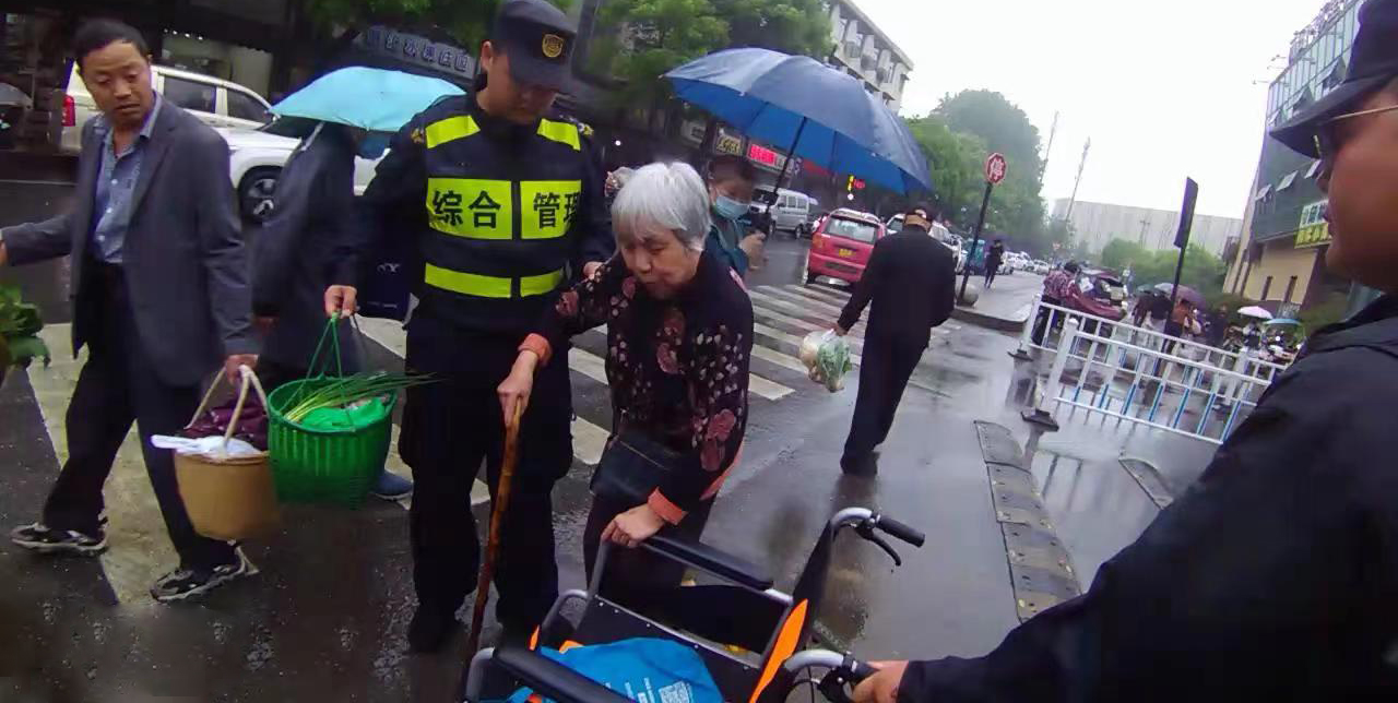 當日7:50,公司員工李學(xué)江、姚迎寒和周銀浩在閑林街道文衛路農貿市場(chǎng)值勤時(shí),遇到一位老人求助,稱(chēng)自己一早來(lái)菜場(chǎng)買(mǎi)菜,坐著(zhù)輪椅走的時(shí)間太長(cháng)了,左腿還患有嚴重的風(fēng)濕病,現在走不動(dòng)回不了家了。