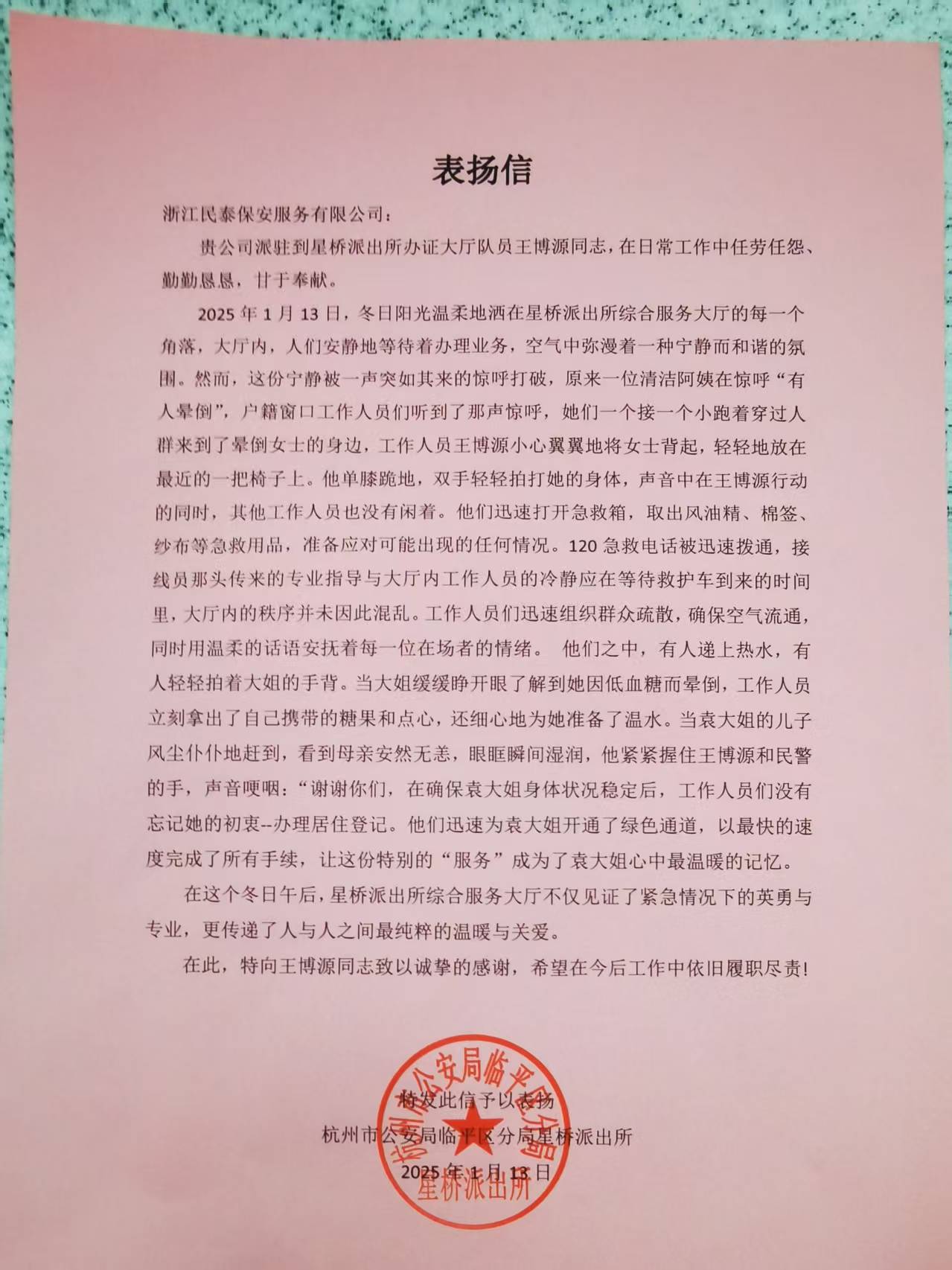 1月17日,浙江民泰公司收到杭州市公安局臨平區分局星橋派出所的表?yè)P信,信中對公司員工王博源熱心救助暈倒阿姨的暖心舉動(dòng)給予了高度贊揚。