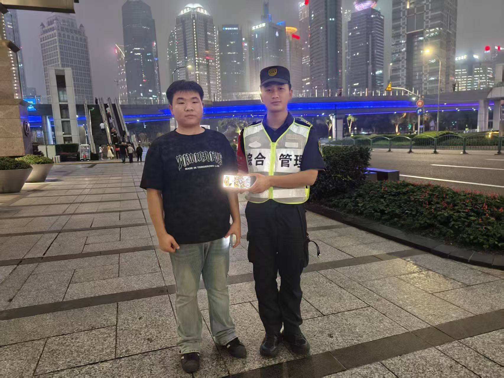 10月15日21:00,宗保公司駐浦東新區陸家嘴綜合管理項目員工李永田在金茂大廈附近巡邏時(shí),撿到一部華為手機??紤]到失主可能會(huì )返回尋找,李永田便在原地等待。