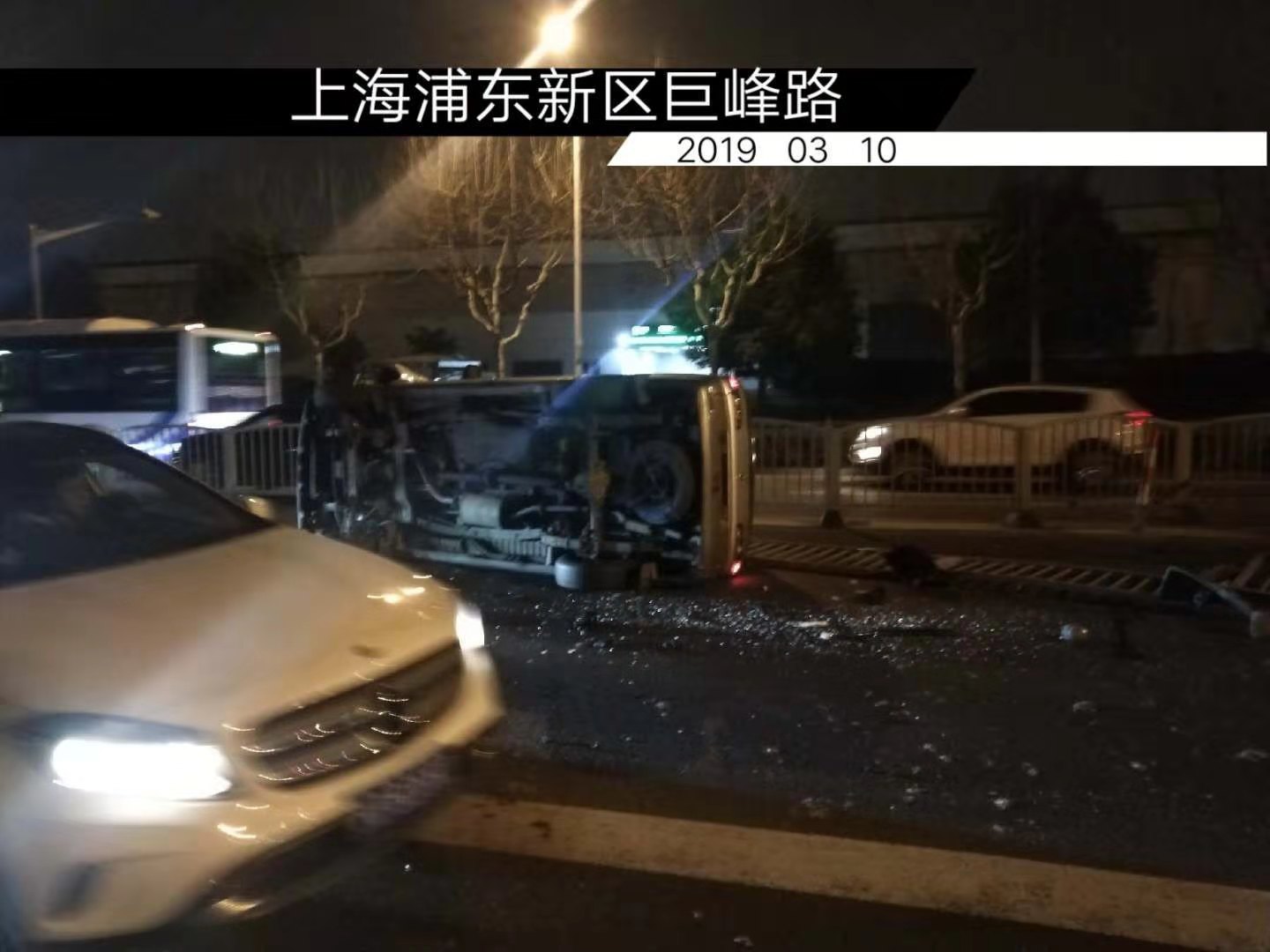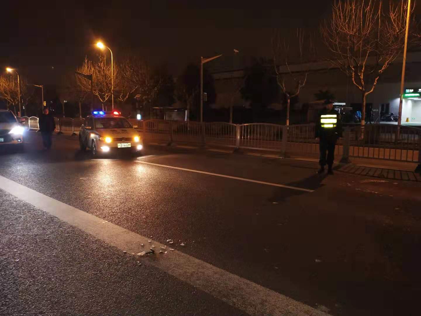 當晚19:20,宗保駐金橋輔警項目隊員張祿祿、高景在申江路地鐵站附近巡邏時(shí),突然聽(tīng)到一聲巨響,兩人聞聲趕去,原來(lái)發(fā)生了一起交通事故。一輛小型面包車(chē)撞在馬路中間的護欄上,發(fā)生了側翻,導致護欄大面積損壞。車(chē)內只有駕駛員一人,詢(xún)問(wèn)駕駛員,表示無(wú)大礙。