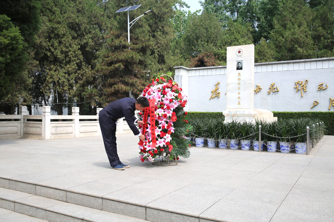 白玉石碑,巍然聳立;蒼松翠柏,莊嚴肅穆。在焦裕祿烈士陵園前,全體同志懷著(zhù)無(wú)比崇敬的心情向焦裕祿烈士敬獻花籃并鞠躬致敬,并重溫入黨誓詞。