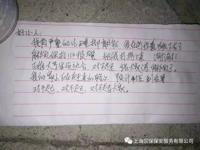 9月13日凌晨5時(shí)20分許,天剛蒙蒙亮,宗保下屬浙江民泰保安公司駐余杭公安倉前派出所巡邏隊員雷亮、劉威震、韓輝,粟建平等人正在轄區內巡邏。在經(jīng)過(guò)良睦路口橋面時(shí),他們發(fā)現橋邊有一雙拖鞋和一個(gè)罐子,罐子下面壓著(zhù)一張紙條!上面有一段寫(xiě)著(zhù):·······我在這個(gè)位置跳下去了·······麻煩把我撈上來(lái)····對不起大家!