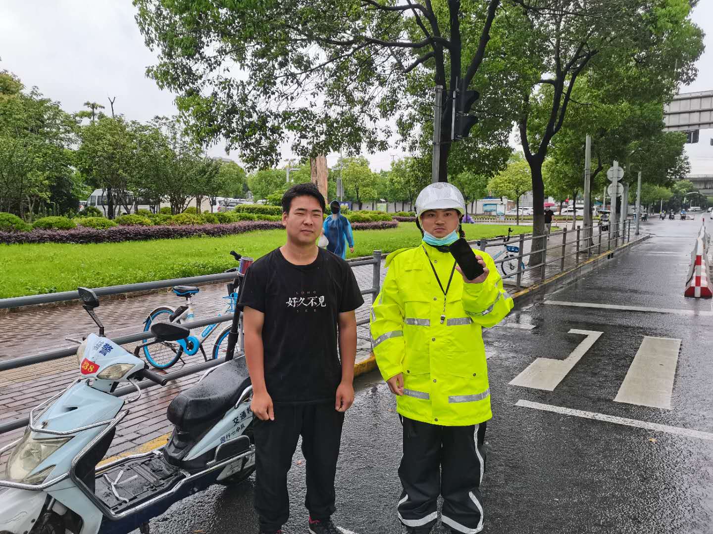 蔣虎第一時(shí)間將情況上報項目負責人,考慮到失主可能沒(méi)有走遠,得到指令后在原地等待。10分鐘后,失主打來(lái)電話(huà),蔣虎和失主約好見(jiàn)面地點(diǎn)。沒(méi)過(guò)多久,一位身穿黑色T恤的男士急匆匆地跑過(guò)來(lái),經(jīng)核實(shí)確認身份后,蔣虎將手機交還失主。失主當場(chǎng)對小蔣表示感謝,并主動(dòng)要求合影。