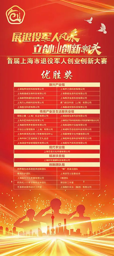 7月28日,首屆上海市退役軍人創(chuàng )業(yè)創(chuàng )新大賽頒獎典禮在浦東新區張江人工智能館舉辦。宗保公司旗下的鷹飛航空科技(上海)有限公司榮獲優(yōu)勝獎。